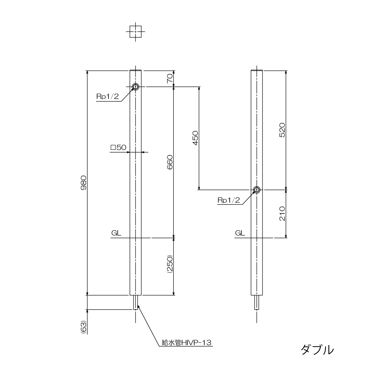 「□50」の、シンプルで細身のアルミ水栓柱。